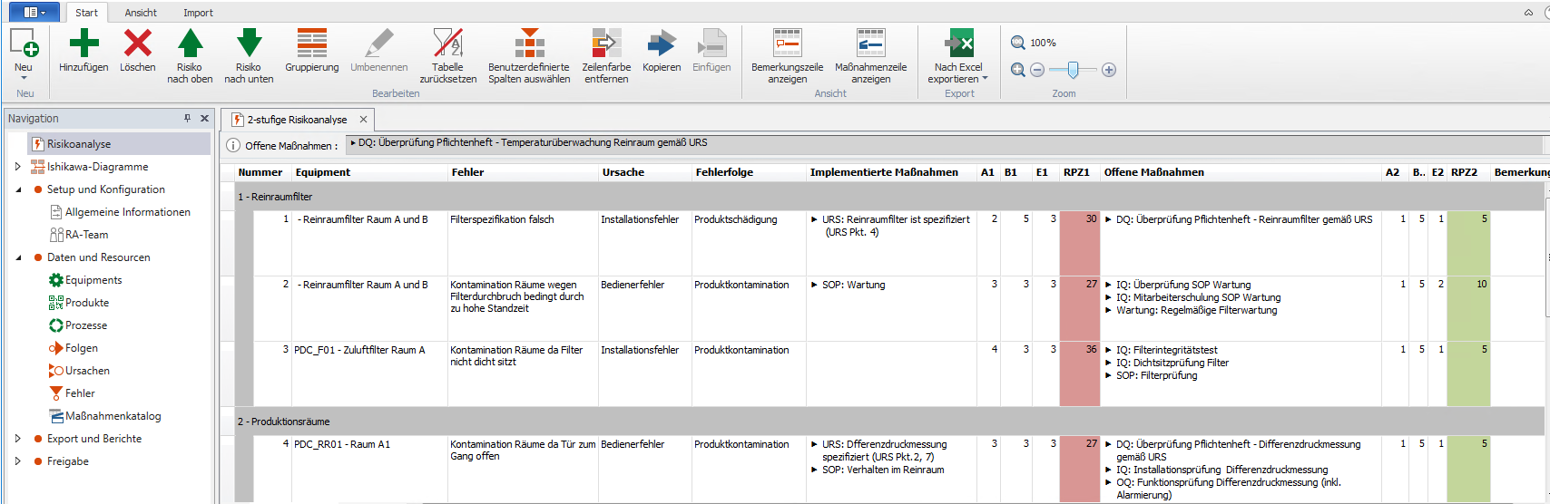In REXS können Sie ihre Risikoanalysen mit Hilfe der Fehler-, Möglichkeits- und Einflussanalyse (FMEA) durchführen. Dazu stehen Ihnen sowohl die 1-stufige als auch die 2-stufige FMEA zur Verfügung.